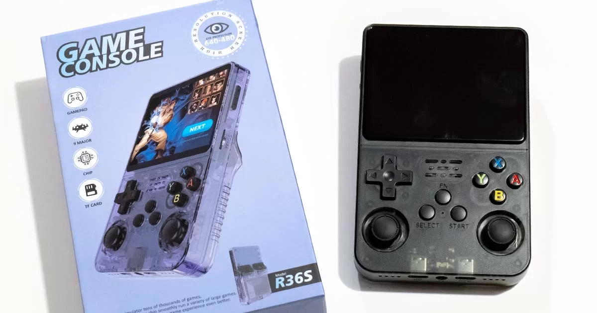 Kapesní retro konzole R36S s 3,5" IPS displejem, 128GB (20 000+ her), procesorem RK3326, baterií 3500 mAh a podporou 15+ emulátorů. K dispozici ve třech barvách: černá, bílá, fialová.