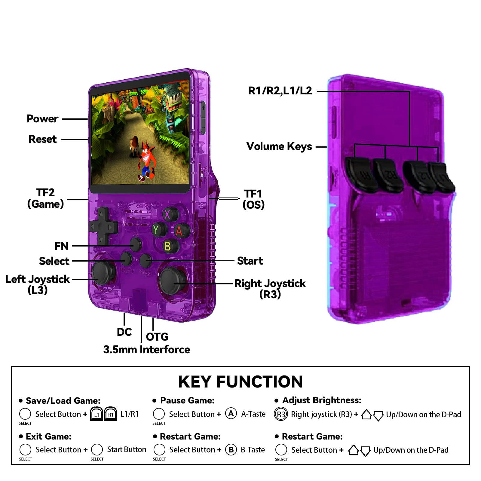 R36S Retro Herní Konzole je kompaktní kapesní herní systém na bázi Linuxu (ArkOS), který tě zavede zpět do zlaté éry videoher. Díky 128GB microSD kartě máš přístup k více než 20 000 předem načtených her ze zástupců jako Nintendo, Super Nintendo, Game Boy, GBA, Sega, PlayStation 1 a další.