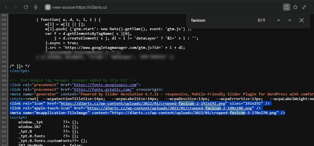 8. Nakonec si zkontrolujeme, jestli v kódu jsou pouze naše meta tagy. V prohlížeči klikněte do refreshované stránky pravým tlačítkem myši a dejte Prouzkoumat zdrojový kód po stisku Ctrl+F (Find) dejte hledat frázi favicon. Stejně tak můžete použít znovu Favicon checker. Já zjistil, že tomu tak úplně není a že moje šablona dál vkládá svoje ikony.